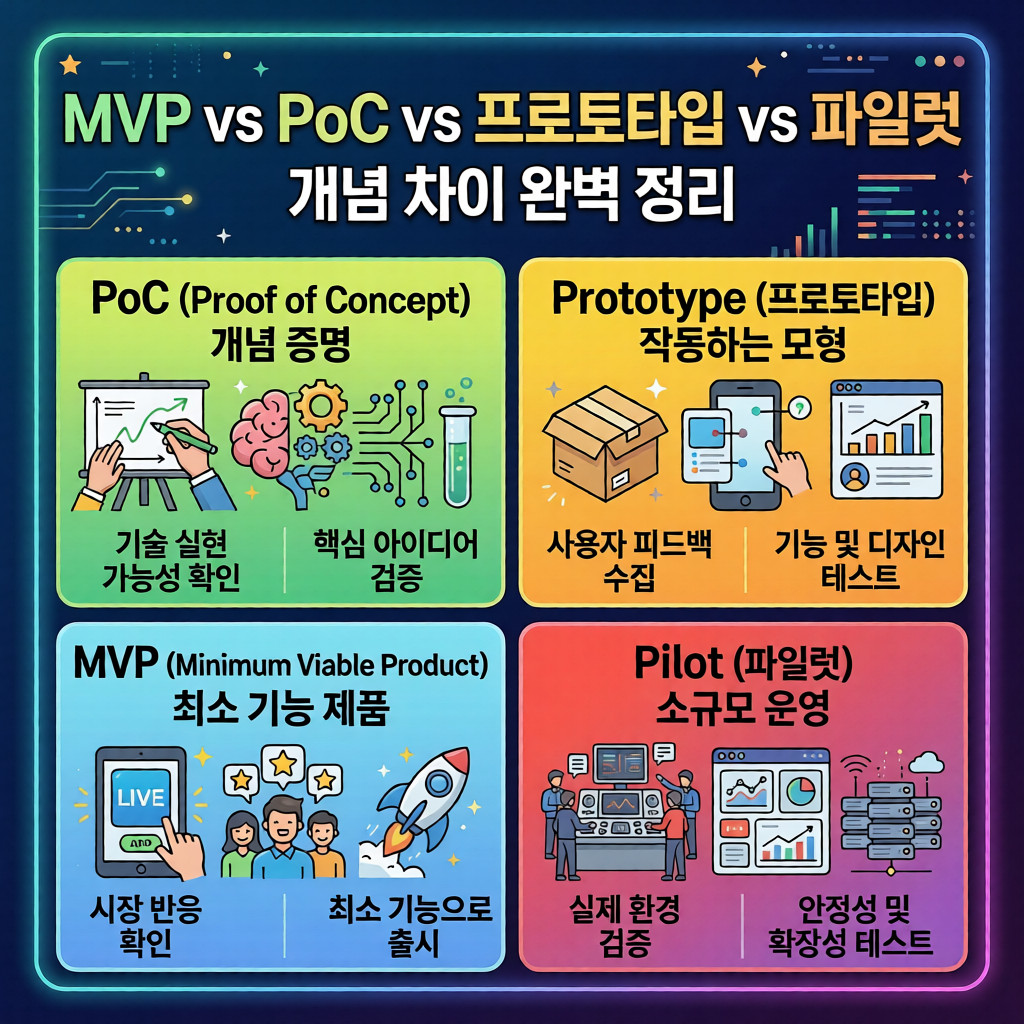 이러한 불상사를 막기 위해 현대의 소프트웨어 공학과 린 스타트업(Lean Startup) 방법론에서는 제품을 본격적으로 개발하기 전, 단계별로 아이디어를 검증하는 장치를 마련했습니다. 그것이 바로 PoC(개념 증명), Prototype(프로토타입), MVP(최소 기능 제품), Pilot(파일럿)입니다.